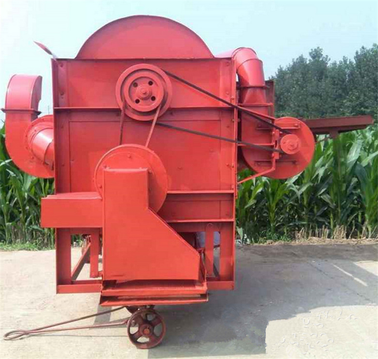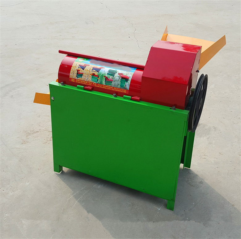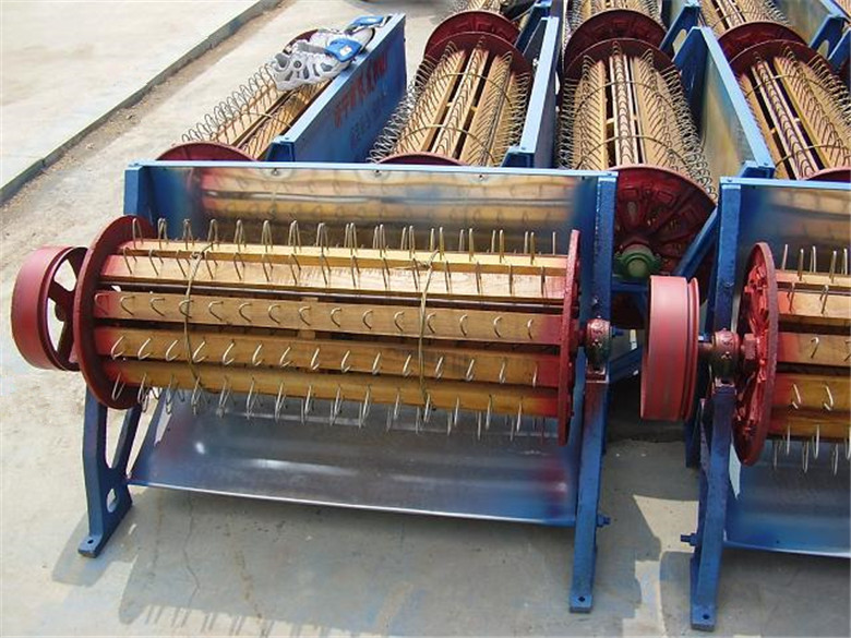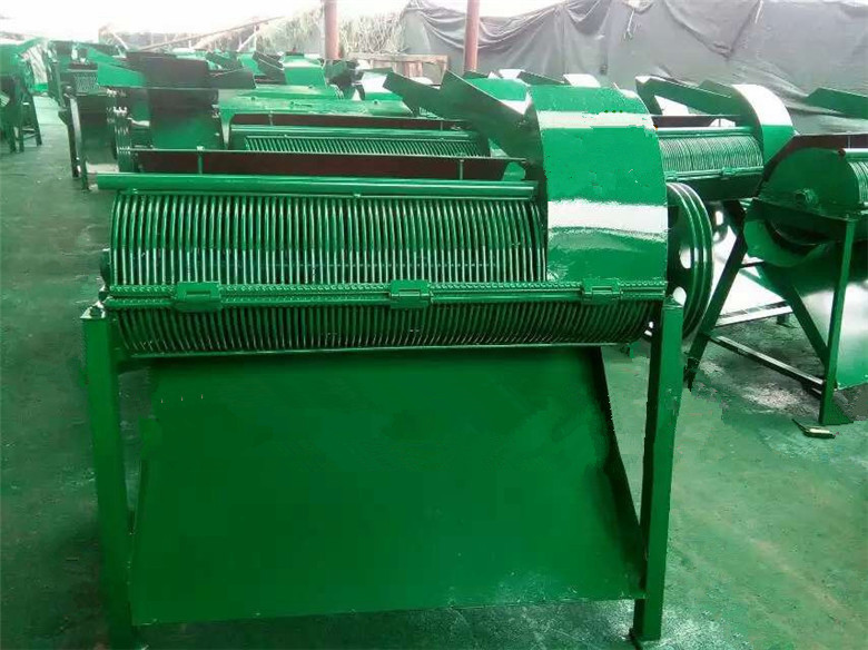 該機(jī)是在機(jī)架上設(shè)有一個(gè)旋轉(zhuǎn)輥,輥上有棱條,機(jī)架上有一個(gè)與旋轉(zhuǎn)輥相對(duì)的帶棱條的固定凹面,固定凹面與旋轉(zhuǎn)輥的下部間距小于上部間距,在機(jī)架上設(shè)有料斗,在旋轉(zhuǎn)輥和固定凹面下部的機(jī)架上設(shè)有斜置的分離篩。