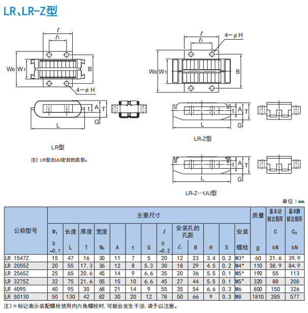 能承受超重載荷且順暢運(yùn)動】 LM滾柱滾動塊結(jié)構(gòu)緊湊,具有耐重負(fù)荷能力,LR50130型的一個單元(長度∶130mm;寬度∶82mm;高度 ∶42mm)能夠承受255kN負(fù)荷。而且,由于是滾動運(yùn)動,本型號摩擦系數(shù)?。?=0.005~0.01),沒有粘滯滑 動現(xiàn)象,因此可獲得高精度直線運(yùn)動。