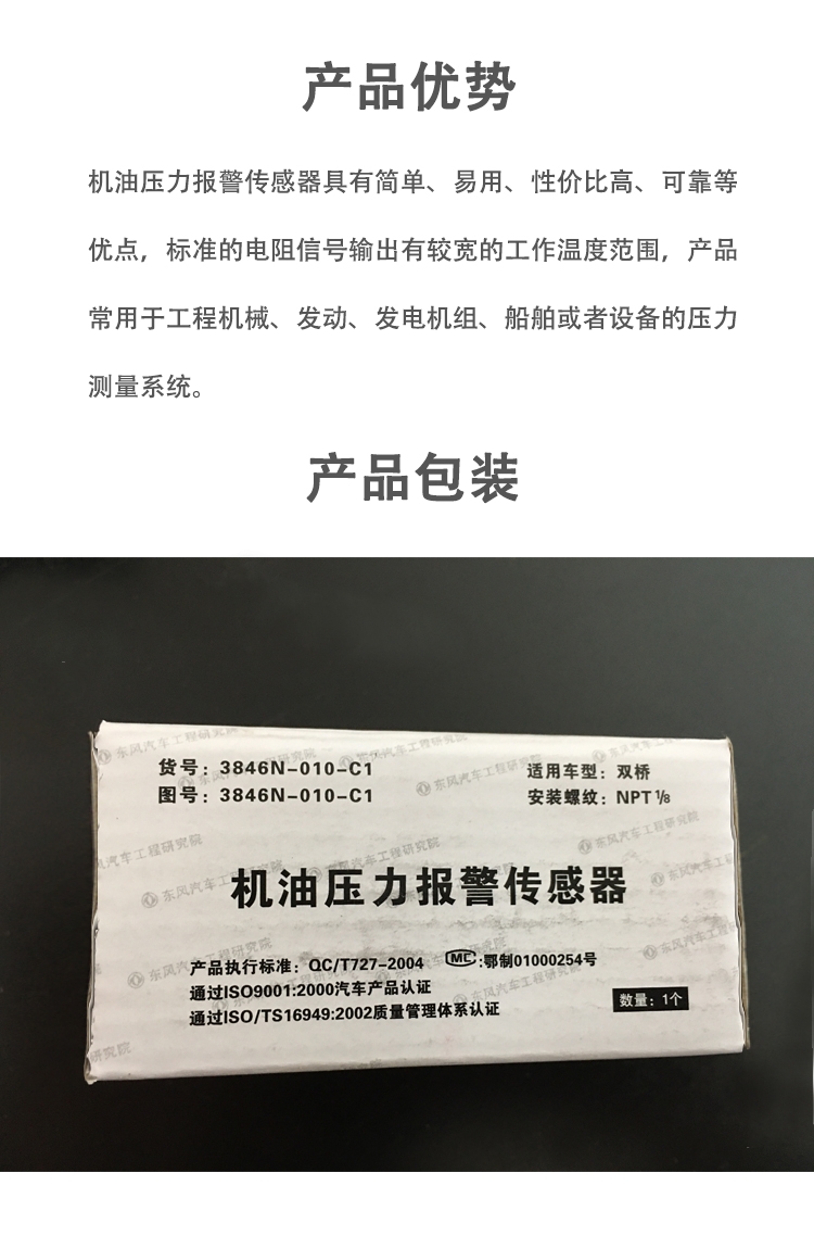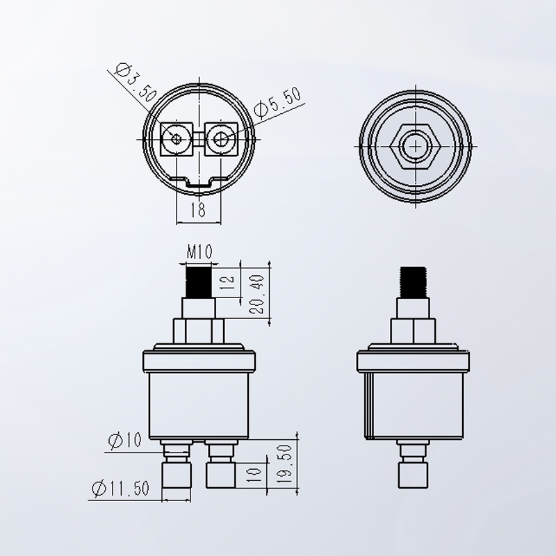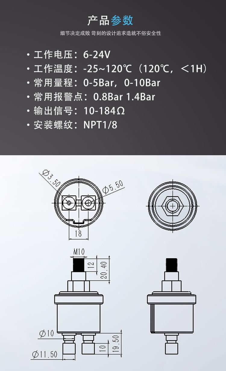 機(jī)油壓力傳感器由信號處理電路、外殼、固定線路板裝置以及2根引線(信號線和報警線) 等組成。信號處理電路由電源電路、傳感器補償電路、調(diào)零電路、電壓放大電路、電流放大電路以及報警電路等組成。