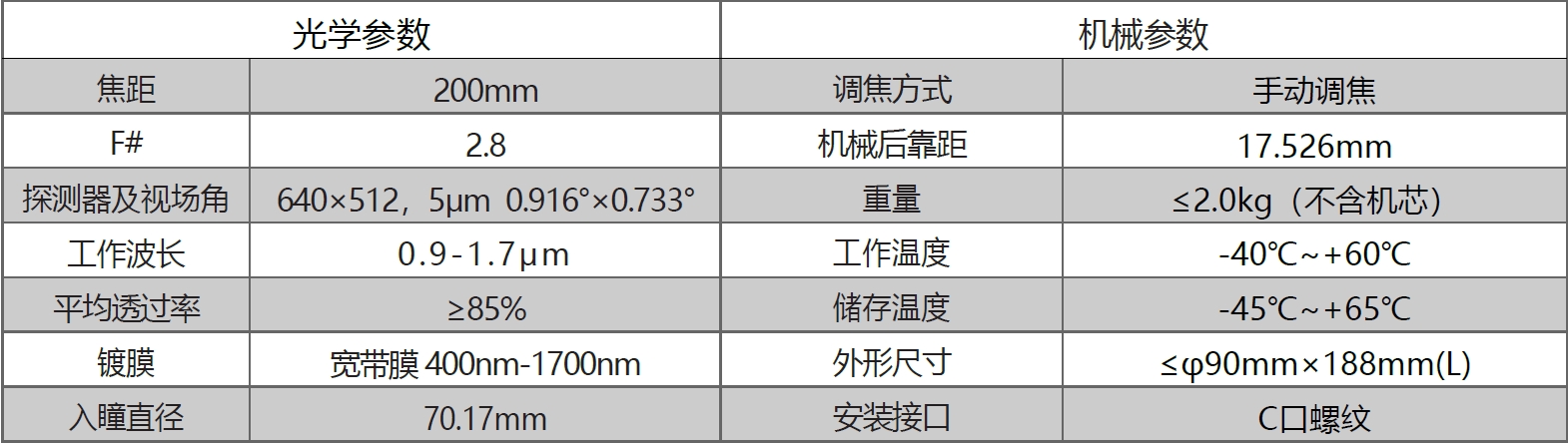 短波200手調(diào)定焦鏡頭是專為短波紅外波段(0.9~1.7μm)設(shè)計(jì)的鏡頭,具有大光圈、低畸變、高分辨率成像等特點(diǎn),可用于全天候監(jiān)控、工業(yè)檢測(cè)、物質(zhì)分揀、高光譜成像及機(jī)器視覺等多種短波紅外成像應(yīng)用。