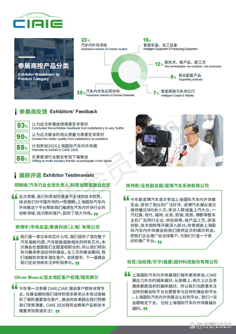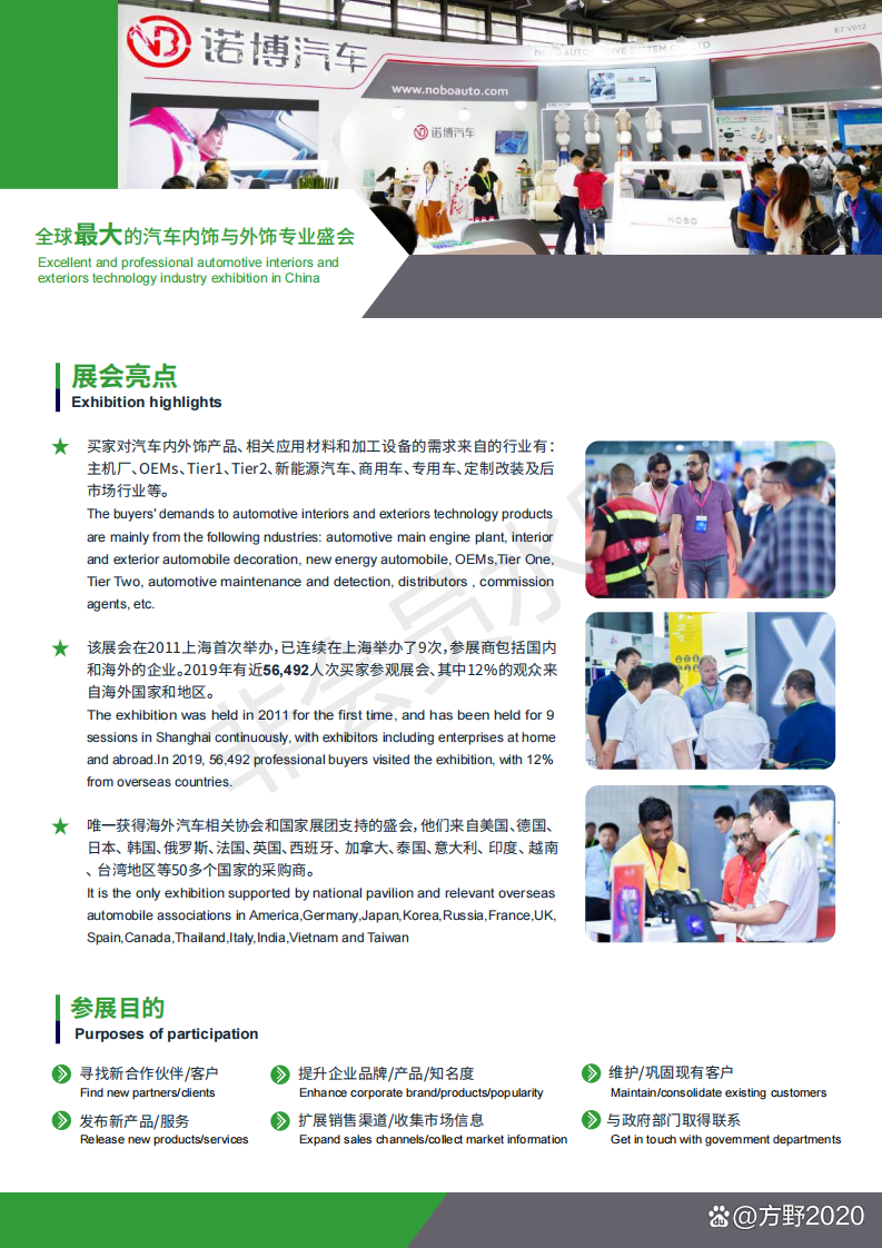 上海國際汽車內(nèi)飾與外飾展覽會CIAIE是國家商務(wù)部唯一支持的汽車工業(yè)展會項(xiàng)目,作為唯一由眾多國內(nèi)外行業(yè)主管部門直接參與組織的汽車內(nèi)飾與外飾領(lǐng)域的專業(yè)展覽,以其“主題明確、特色突出、注重實(shí)效、不斷創(chuàng)新”的一貫風(fēng)格,在行業(yè)中的知名度與影響力與日俱升。業(yè)內(nèi)人士已將其視為“了解行業(yè)信息、把握市場動態(tài)、展示企業(yè)品牌、拓展貿(mào)易渠道、尋求合作機(jī)會”的最佳平臺。展會的良好效果贏得了眾多展商和觀眾的好評與青睞。